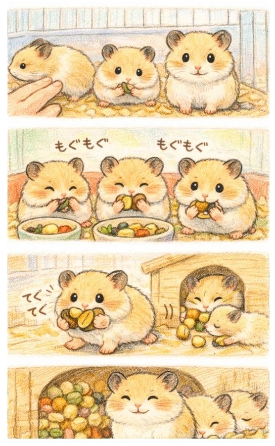 キンクマハムスターのデグちゃん 2026.04.15 ペットショップで出会ったキンクマハムスターのデグちゃん。 3兄弟で家に迎えました。 その中でも賢くて優しく大人しい子でした。 食べ物の好き嫌いもなくゴハンを運ぶのが上手でした。