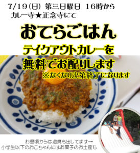 2020年7月19日 おてらごはん★カレーを無料配布します 2020.06.032020.07.07 カレー大好き住職が腕を振るってカレーをご供養します。 無料配布です。普通のカレーです。 美味しくなくてもご勘弁くださいm(_ _)m 50食くらいは用意する予定ですが、品切れになったらごめんなさいm(_ _)m お昼から子ども向けの遊具も出しています。 駄菓子やさんも(^^)