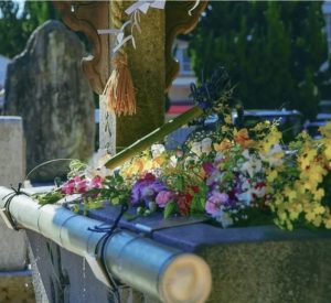 Throughout the year, the hanachozu (flower-filled water basins) are decorated with seasonal blossoms.